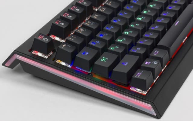 При недостаточном внешнем освещении читаемости способствует подсветка, которую можно отключить. Светодиод подсветки расположен по верхней стороне каждой клавиши, поэтому символы также смещены к верхнему краю колпачков. Подсветка может работать в двух режимах: постоянное свечение, когда каждый ряд клавиатуры горит своим цветом, или дыхание. Кроме этого, можно изменить скорость дыхания и яркость подсветки. В общем, набор режимов работы подсветки очень скромный, да и возможность выбрать цвет отсутствует.