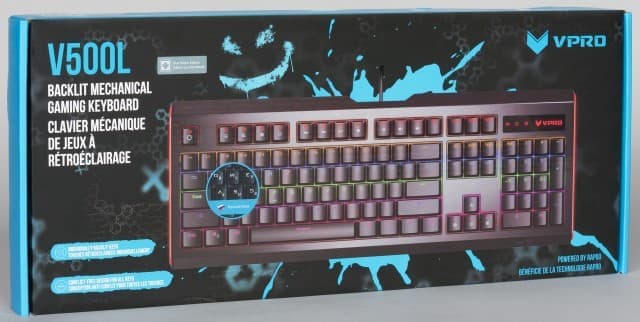 Игровая клавиатура Vpro V500L продаётся в типичной по габаритам картонной коробке, оформленной в чёрно-голубых цветах. На обратной стороне можно найти описание ключевых особенностей модели на русском языке. Детальных спецификаций на коробке нет.