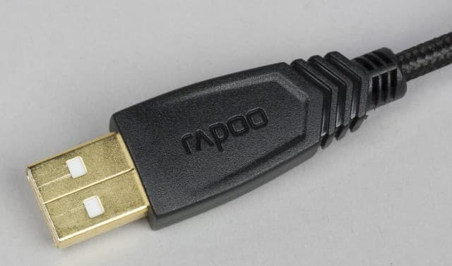 Интерфейсный кабель длиной 156 см защищён текстильной оплёткой, позолоченный штекер USB оригинальной формы снабжён фирменной надписью Rapoo.