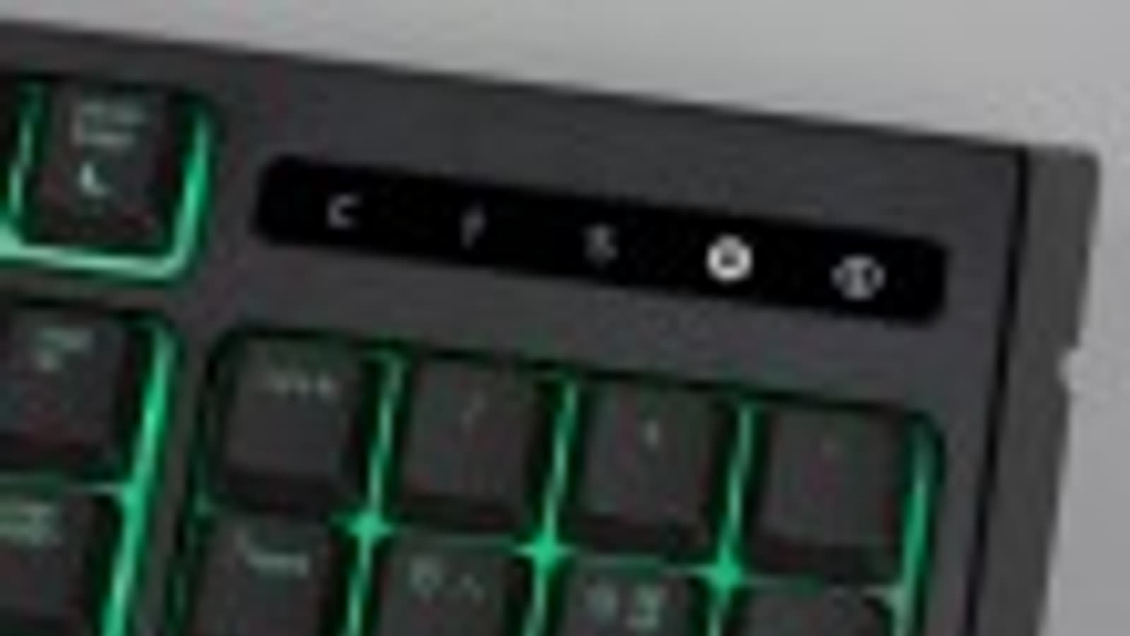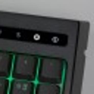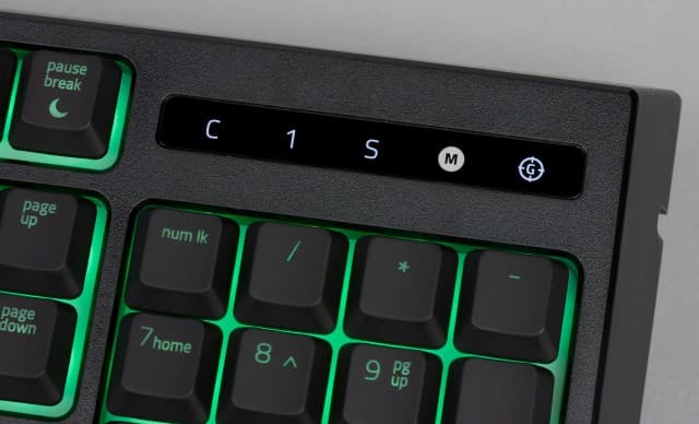 В верхнем правом углу находится блок индикаторов. Кроме трех стандартных «локов» со светодиодами белого цвета, здесь есть индикатор записи макро и индикатор игрового режима. Заметим, что подписи выполнены белым на чёрной глянцевой вставке, так что днём при достаточном внешнем освещении считывать индикаторы не всегда удобно.