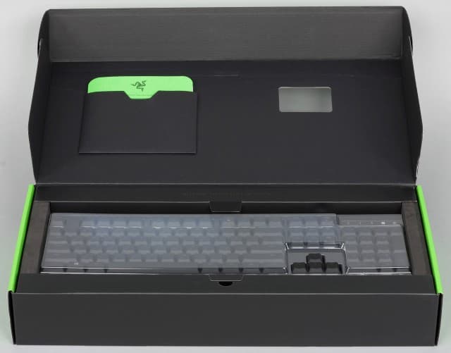 Не удивительно, что с оформлением упаковки у данного производителя всё отлично. Крепкий картон, фирменные зелёные тона, фотография клавиатуры в глянцевом лаке, специальное окошко для проверки ощущений от клавиш — всё это говорит о классе продукта.