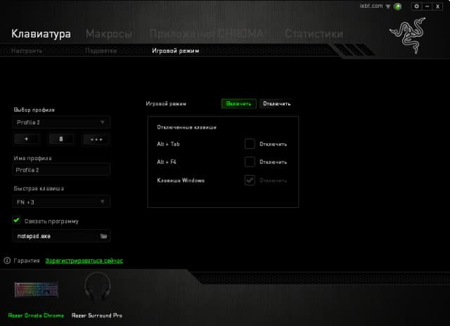 На профиль можно также назначить использование игрового режима. В нем блокируется работа кнопки «Windows», но можно также отключить сочетания Atl+Tab и Alt+А4.