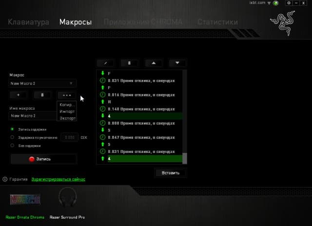 Управление макрокомандами выделено на отдельную страницу. При этом они являются общими сразу для всех профилей. Здесь есть операции удаления, создания, экспорта, импорта и редактирования наборов команд.