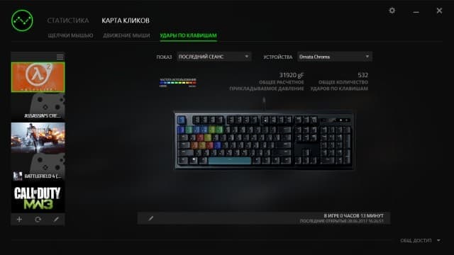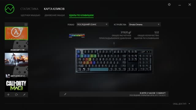 Ещё одной интересной функцией программы является модуль сбора статистики использования клавиатуры и мыши (мышка должна быть тоже от Razer). В частности, вы сможете посмотреть информацию о числе и интенсивности использования клавиатуры с группировкой по приложениям и статистикой по датам.
