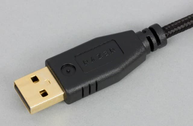 Для подключения клавиатуры используется несъёмный кабель длиной немногим более двух метров. Он имеет чёрную тканевую оплетку, достаточно большую (около 4 мм) толщину, среднюю жёсткость и заканчивается компактным разъёмом USB.