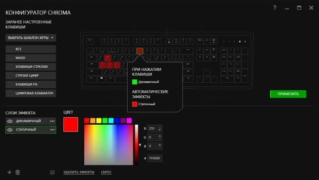 Если этого мало, то можно обратиться к разделу «Конфигуратор Chroma», в котором реализовано создание собственных схем с использованием готовых шаблонов. Так, здесь используются предустановленные блоки (например, WASD, цифры, стрелки и т. п.) или любые наборы кнопок на которые вы накладываете слои с эффектами.