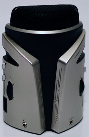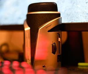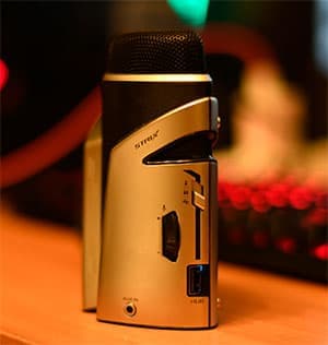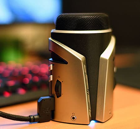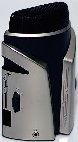 В правой части лицевой стороны микрофона расположен трёхступенчатый тумблер и колесо-реостат для регулировки мощности передаваемого в ПК сигнала от самого микрофона через интерфейс USB. Всего микрофон оснащён двумя портами USB, один используется для подключения к ПК, а ко второму можно подключить внешнее устройство, например, клавиатуру или мышку.