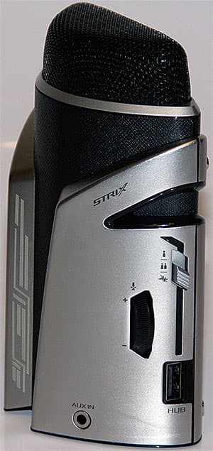 На левой фронтальной части игрового микрофона ROG Strix Magnus находятся две небольшие кнопки, которые отвечают за изменение режима работы подсветки и включения/выключения микрофона. Рядом расположено колесо-реостат, позволяющее изменять уровень в наушниках, если они подключены к соответствующему выходу микрофона, который находится чуть ниже самого колеса. На левой стороне микрофона — разъём мини-джек с подписью «Aux In». Это универсальный вход для подключения внешних устройств.