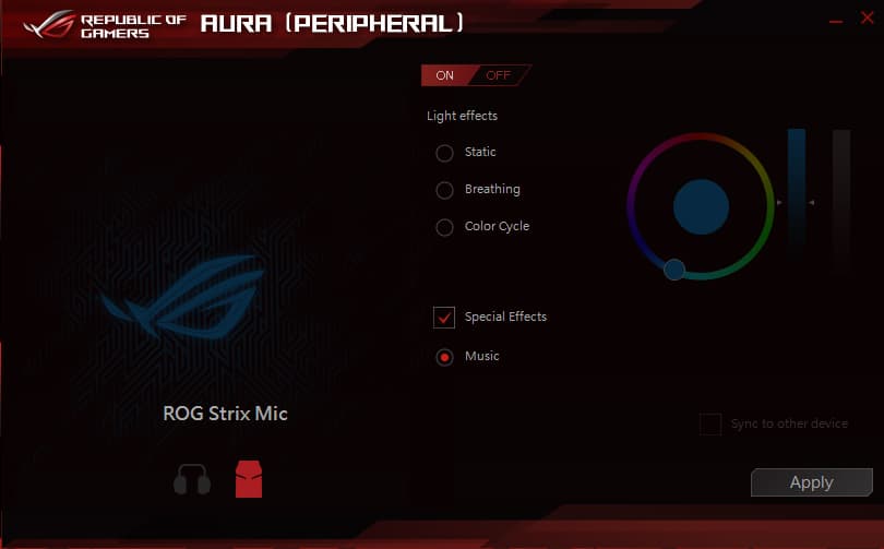На официальном сайте Asus ROG доступна для загрузки утилита Aura (Peripheral), которая позволяет настраивать цвет и режим работы подсветки микрофона. Кроме этого, можно включить синхронизацию подсветки микрофона с другими устройствами ROG.