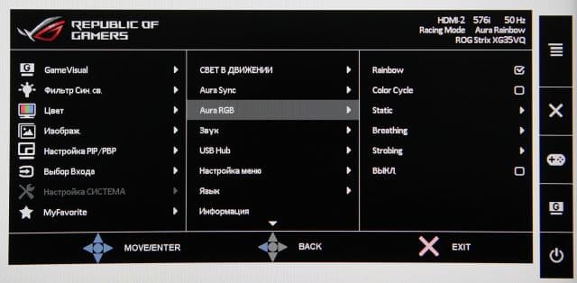 При подключении монитора к компьютеру по USB управлять подсветкой кольца можно с помощью приложения AURA Sync Lighting Control.