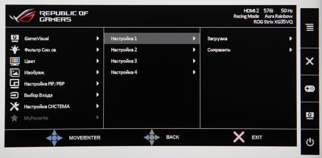Подсказки нам говорят: джойстик — вход в меню и манипуляции с ним, кнопка ниже — выход из пункта/меню/отмена режима, ещё ниже — кнопка вызова функций GamePlus, и ещё ниже — кнопка выбора режимов GameVisual. Самая нижняя кнопка — это кнопка питания. Работу всех кнопок или только кнопки питания можно заблокировать в меню. Основное меню большое. Текст в меню относительно мелковат, но его абсолютные размеры обеспечивают приемлемую читаемость. При настройке изображения меню остаётся на экране, что немного мешает оценке вносимых корректировок. Настраивается прозрачность фона и задержка автоматического выхода из меню. Настройки монитора можно сохранить в одном из четырёх профилях.