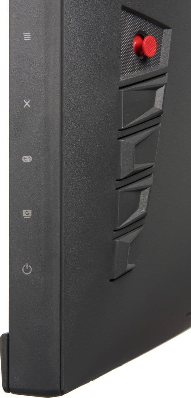 Фронтальная поверхность экрана выглядит как монолитная поверхность, ограниченная снизу относительно узкой рамкой, а по периметру — узкой окантовкой. Выведя изображение на экран, можно увидеть, что на самом деле между внешними границами экрана и собственно областью отображения есть неширокие поля. Справа внизу на боковой грани фронтальной рамки нанесены значки кнопок, а сами кнопки расположены на задней панели напротив меток. Верхняя кнопка представляет собой 5-позиционный джойстик, а форма других кнопок чередуется.
