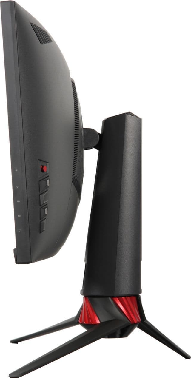 Монитор Asus ROG Strix XG35VQ имеет отличный набор игровых функций, узнаваемый дизайн и сверхширокоформатный экран с радиусом изгиба 1,8 м. Дополнительно монитор выделяет красная проекция на стол и подсветка логотипа, а также многоцветная статичная или динамичная подсветка кольца на задней панели, настраиваемая как из меню монитора, так и с помощью программы AURA Sync Lighting Control. Отметим возможность настройки монитора с компьютера, в том числе привязку профиля к текущему активному приложению.