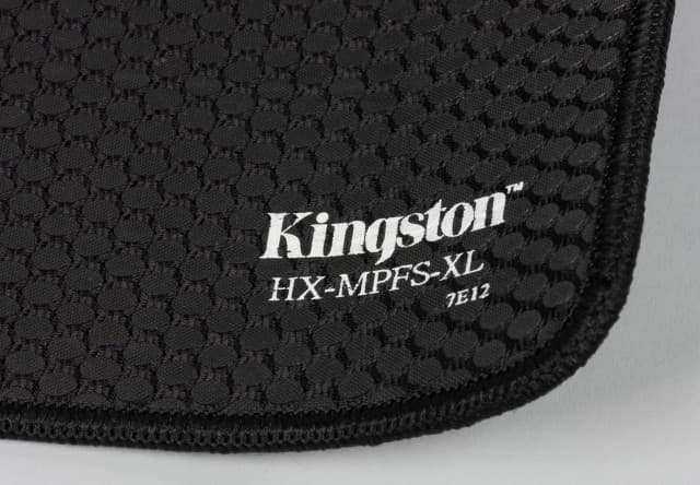 Нижняя часть ковра, пожалуй, даже более интересна. Основной лист резины имеет «шершавую» фактуру, в которую «впаяна» плетёная сетка из чёрных ниток. Выглядит это отлично и, что более важно, обеспечивает великолепную устойчивость на столе. В одном из углов снизу нанесено лого Kingston и артикул модели.