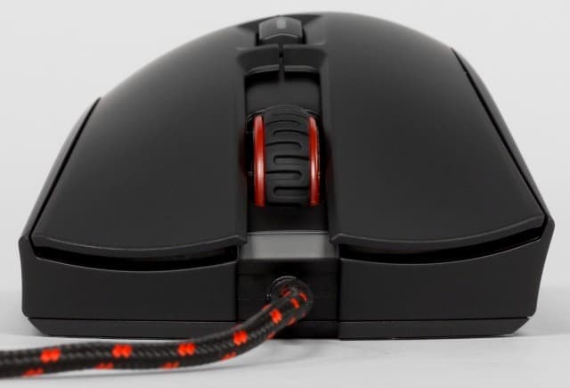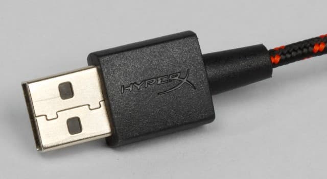 Подключение к компьютеру осуществляется через стандартный кабель USB, имеющий длину 1,8 м. Для защиты от повреждений в месте выхода из мышки установлена гибкая муфта, которая дополнительно немного приподнята вверх. Кабель получил чёрную тканевую оплётку с вкраплениями красного. Он не очень толстый и в меру жёсткий.