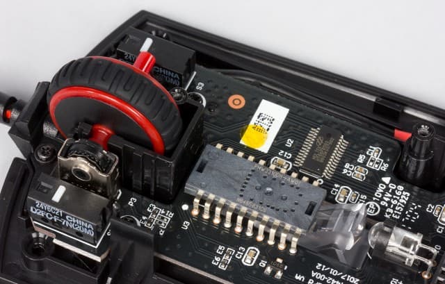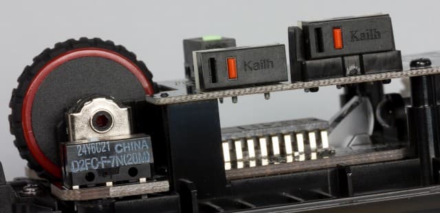 В данной модели применяется энкодер TTC, а вот определить бренд кнопки колеса формата tact switch не удалось (скорее всего, это модель от Kailh). Нажимается она с заметным усилием и глухим щелчком.