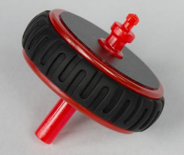 Колесо прокрутки изготовлено из красного полупрозрачного пластика и дополнительно имеет «покрышку» из чёрной резины с характерным рисунком. Оно получило диаметр 24 мм и 24 шага трещотки. Последняя очень мягкая и тихая. Если вам будут требоваться чёткие движения на фиксированное число позиций, придётся долго тренироваться.