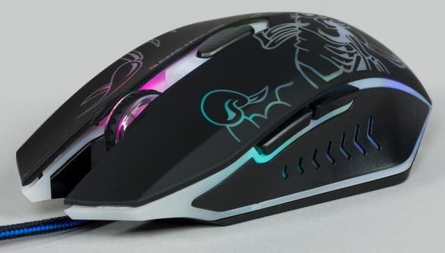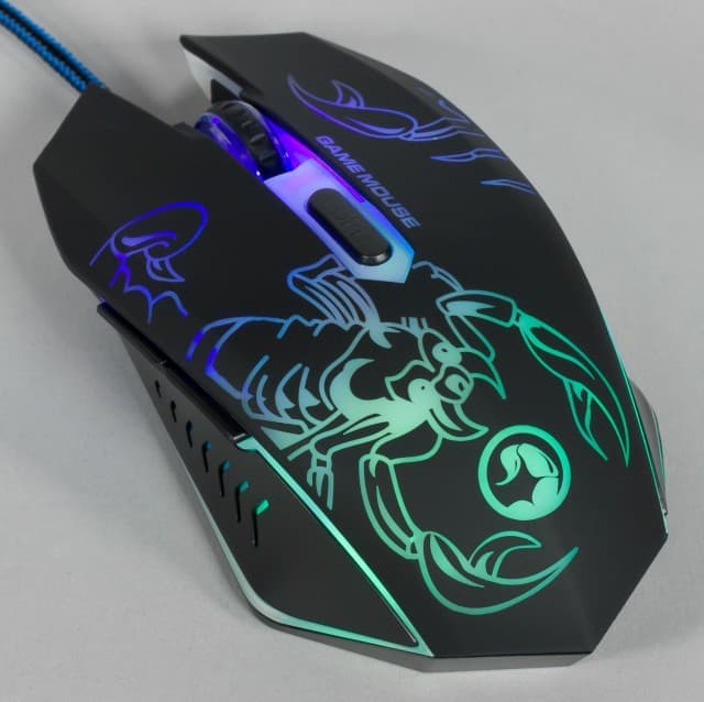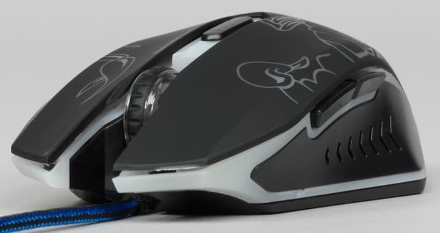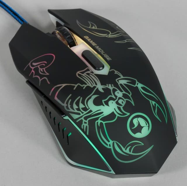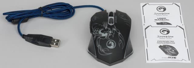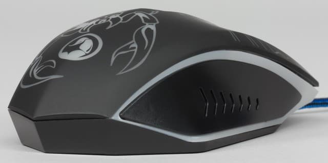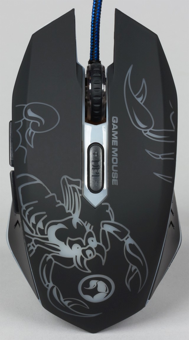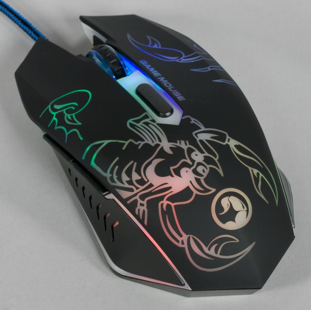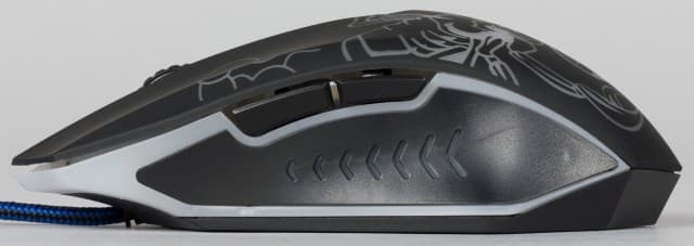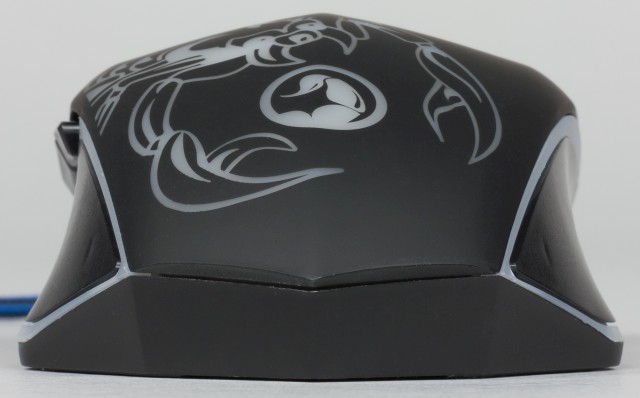 На основной части корпуса находится «тату» в виде скорпиона, который обхватывает почти всю мышь, контуры сделаны прозрачными, что позволяет проходить свету от встроенной подсветки.