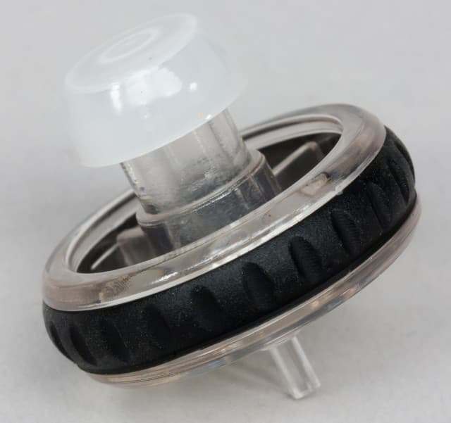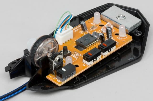 У колеса прокрутки обод сделан из резины, а основа — из полупрозрачного пластика. Диаметр колеса — 24 мм, контроллер механический.