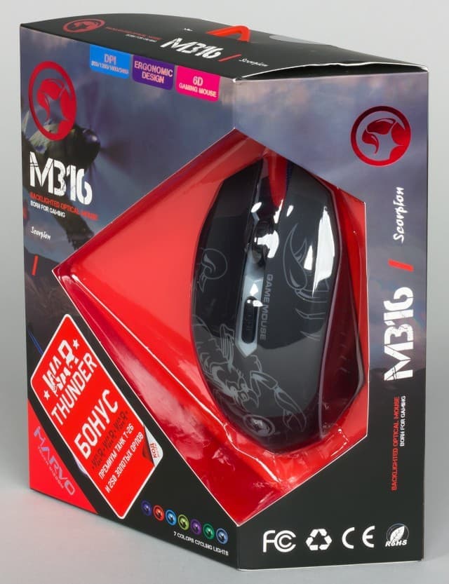 Marvo M316 поставляется в тёмно-красной коробке в форме вытянутого параллелограмма. На передней части упаковки есть ромбовидный вырез, который позволяет посмотреть на мышку через блистер, а также краткая информация об особенностях мышки и «Бонус» для игры War Thunder, гласящий «Премиум Т-26 и 250 золотых орлов». Непонятно. На левом боку коробки написано, какая у мышки подсветка, и проиллюстрировано, как она будет выглядеть при подключении к вашему ПК, а на задней части размещена полная информация о мышке на семи языках, в том числе и на на русском.