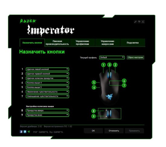 Манипулятор подключается к компьютеру посредством USB-соединения. Длинный двухметровый провод защищен оплёткой, которая позволяет избежать механических повреждений в ходе активной эксплуатации. Операционная система сама определяет устройство, все кнопки работают в режиме «по умолчанию». Дополнительное программное обеспечение необходимо для тонкой настройки. Драйвера скачиваются отдельно с сайта производителя, там же можно найти и новую прошивку. Установка проходит быстро, и после перезагрузки системы можно приступать к изучению ПО. Поддержка русского языка присутствует. Интерфейс конфигуратора разбит на пять разделов. В одном дозволено переназначить функции кнопок, в том числе и прокрутку колёсика, как вам заблагорассудится или установить макросы на соответствующие кнопки.