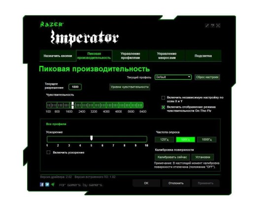 Раздел «Пиковая производительность» позволяет подкрутить чувствительность мыши, определить количество уровней у режима переключения чувствительности «на лету». Также можно включить или отключить индикатор, возникающий в углу экрана при переключении dpi, включить или отключить независимую настройку осей X и Y, настроить калибровку поверхности. Все манипуляции делаются для действующего или выбранного вами профиля. Для всех профилей настраивается уровень ускорения мыши, частота опроса (125 Гц, 500 Гц, 1000 Гц).