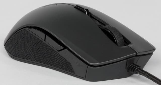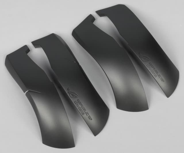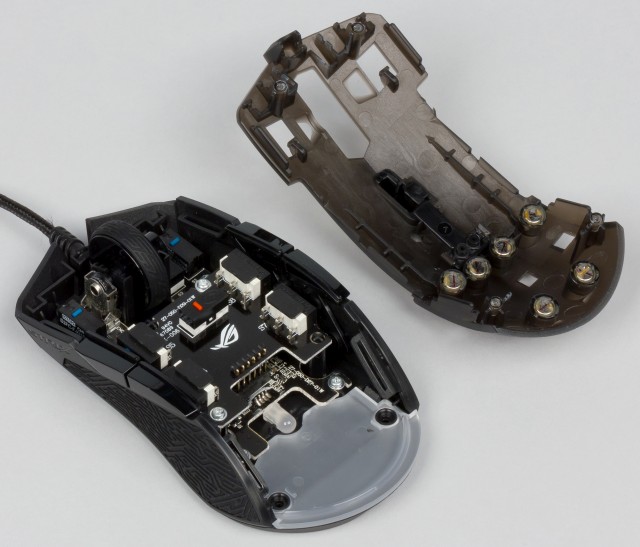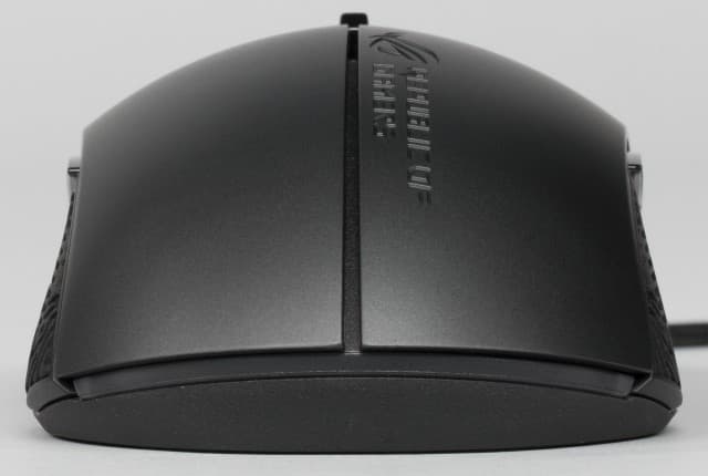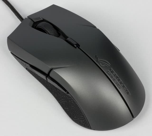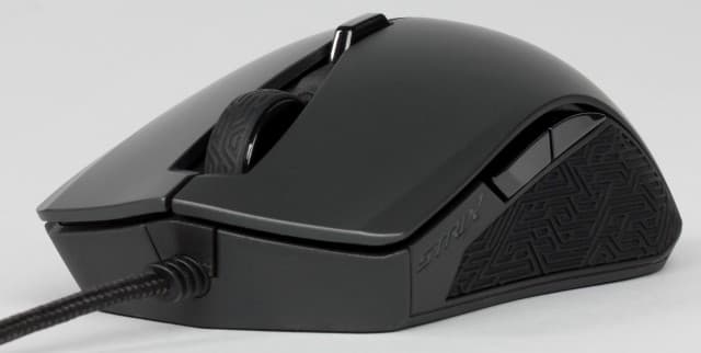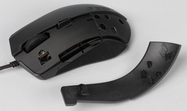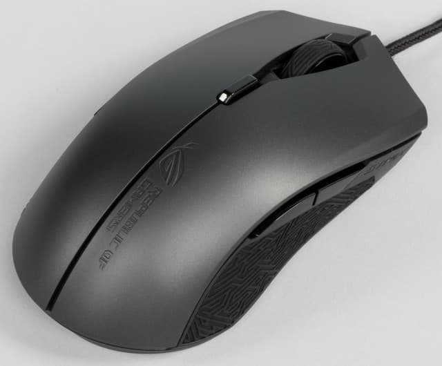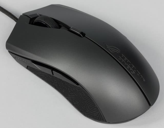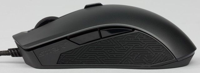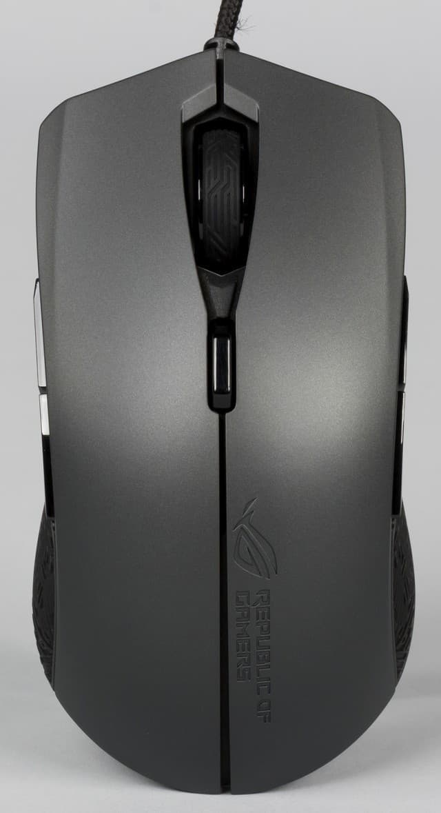 Верхние панели изготовлены из приятного на ощупь тёмного матового пластика с небольшой примесью металлика. Скошенные боковые грани помогают удерживать мышку в руке. Кроме того, на них установлены вставки из резины с оригинальным рисунком серии ROG, что увеличивает комфорт.
