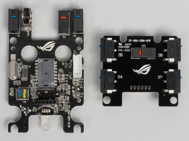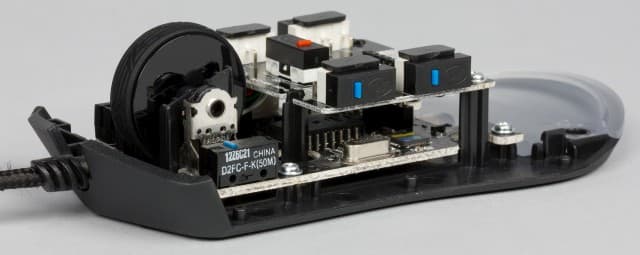 Собрана электронная начинка, как обычно и бывает в подобных моделях, на двух печатных платах. На основной расположены сенсор, процессор, три главные кнопки, энкодер колеса и светодиод. На дочерней — четыре дополнительные кнопки и кнопка переключения разрешения. Сборка аккуратная, платы чистые, кабель USB подключён через разъём.