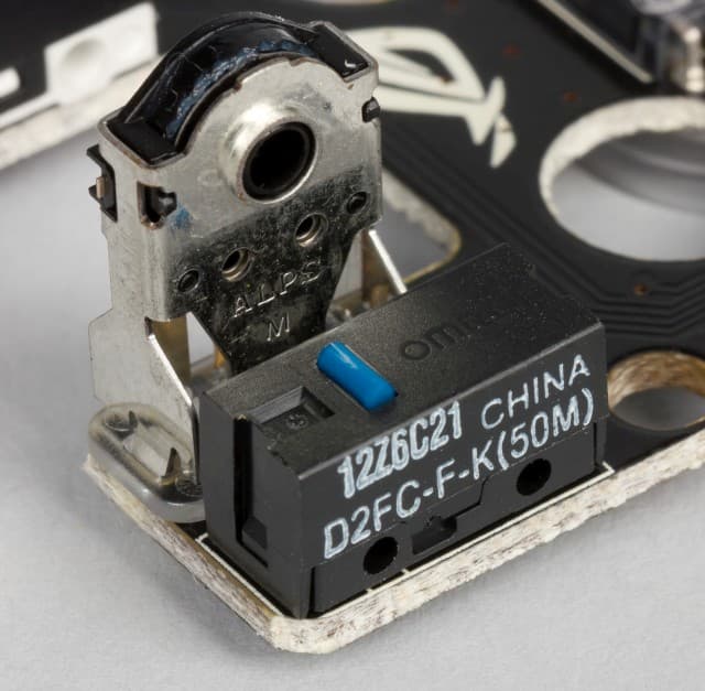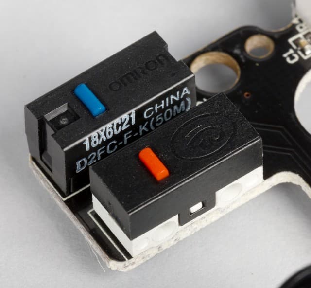 Основные переключатели мышки — знакомые Omron D2FC-F-K(50M) китайского производства с голубыми кнопками. Такие сегодня часто встречаются в игровых мышках известных брендов. Заявленный ресурс в 50 миллионов срабатываний немного отдает «китайскими ваттами», но в любом случае — эта модель в настоящий момент является одним из лучших вариантов.