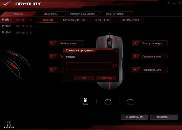 Собственно, настройки мышки могут записываются в профили, которых предусмотрено три. Возможности добавить ещё несколько здесь нет. Переключение между ними осуществляется комбинацией кнопок или привязкой к запущенной программе.