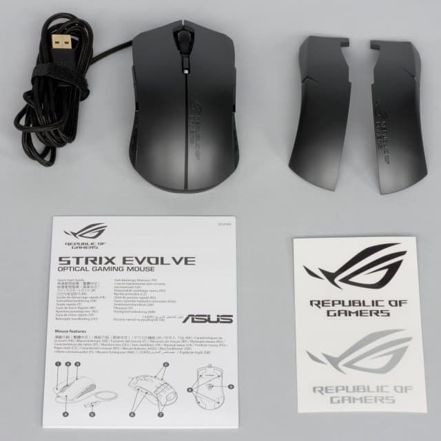 В комплект поставки мышки входят две сменные панели корпуса (в дополнение к двум уже установленным), краткая инструкция на нескольких языках, включая русский, и две наклейки Republic of Gamers. Единственное, что не очень понятно, как предполагается хранить сменные панели.