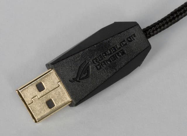 Штекер USB имеет небольшие размеры, так что не будет мешать соседним портам. А вот его форма может быть не очень удобна для отключения — грани плоские и скошенные, зацепиться не за что. Отметим также наличие на разъёме логотипа ROG.
