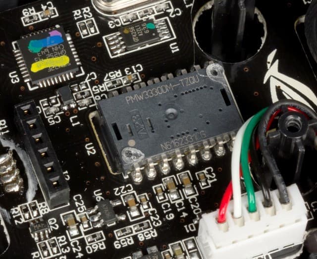 Мышка использует сенсор Pixart PMW3330, который сегодня является одним из наиболее интересных для игрового сегмента. Он обеспечивает разрешение 7200 сpi, скорость 130 ips и ускорение 30 g. В данной модели датчика установлен встроенный ИК-светодиод подсветки, что упрощает конструкцию и позволяет обеспечить указанные значения технических характеристик.