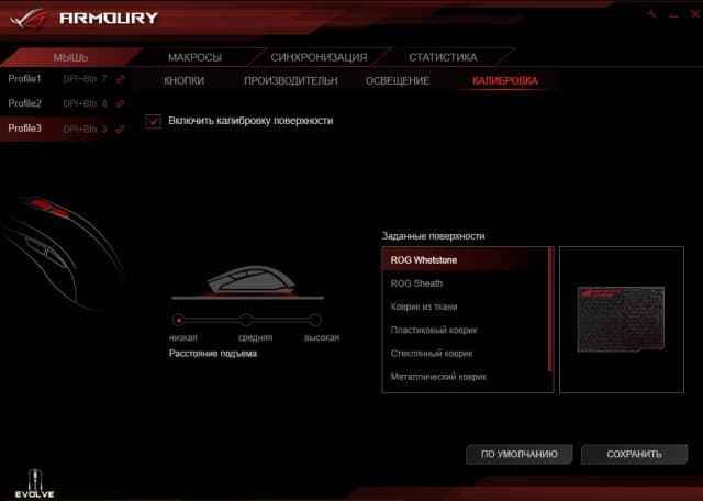 Завершает настройку параметров мышки страница «Калибровка». Здесь можно настроить сенсор на тип вашего коврика. В списке присутствует несколько предустановленных вариантов, включая фирменные ковры Asus ROG. Интересно, что для данной модели, в отличие от Asus ROG Pugio, возможности ручной калибровки нет.