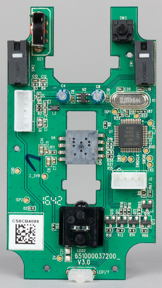 Видно, что интерфейсный кабель подключён через разъём, а в монтаже при менены две печатные платы. На одной располагается оптический сенсор, контроллеры, светодиод подсветки и переключатели основных кнопок.