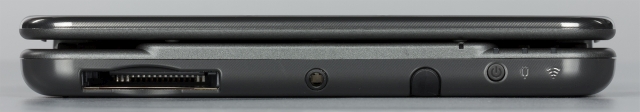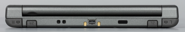 На нижней грани (если смотреть на консоль в закрытом виде) располагается разъем для картриджа, углубление для стилуса и разъем миниджек для подключения проводной гарнитуры. Сюда же переехала кнопка включения и выключения консоли. Она немного выпирает за пределы корпуса. Как следствие, не исключены случайные нажатия. В предыдущей модели эти неприятности были невозможны, поскольку кнопка включения находилась возле нижнего экрана. «Дыра» для картриджа теперь маячит перед глазами и не добавляет эстетичности внешнему виду New 3DS XL.