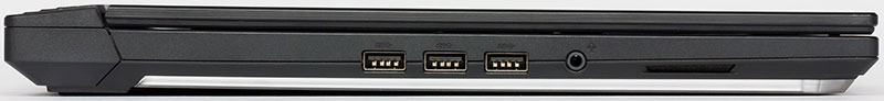 С левой боковой стороны корпуса ноутбука выведены три порта USB3.0 и комбинированный разъём для наушников или микрофона.