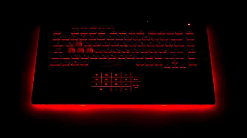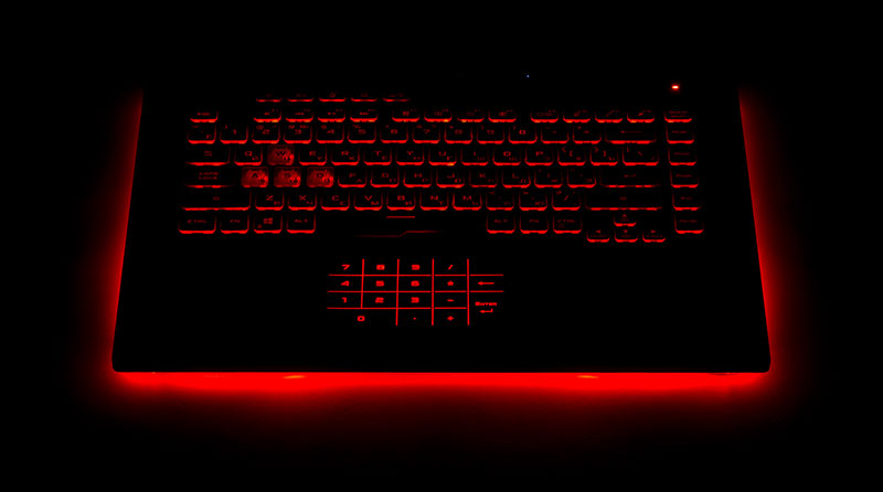 Клавиатура и тачпад оснащены настраиваемой подсветкой, но самое интересное, что подсветка встроена и в основание ноутбука, что делает его очень выразительным, в особенности в темноте.