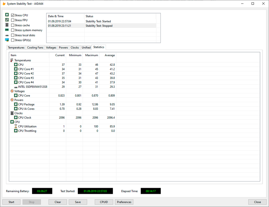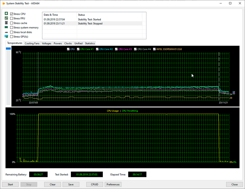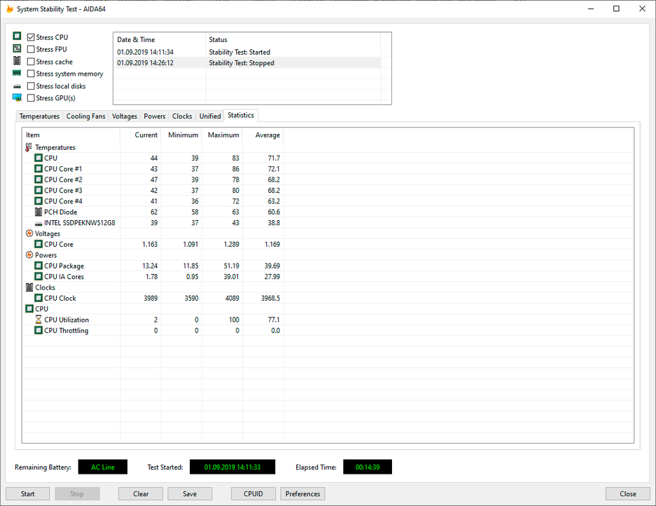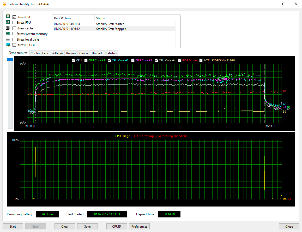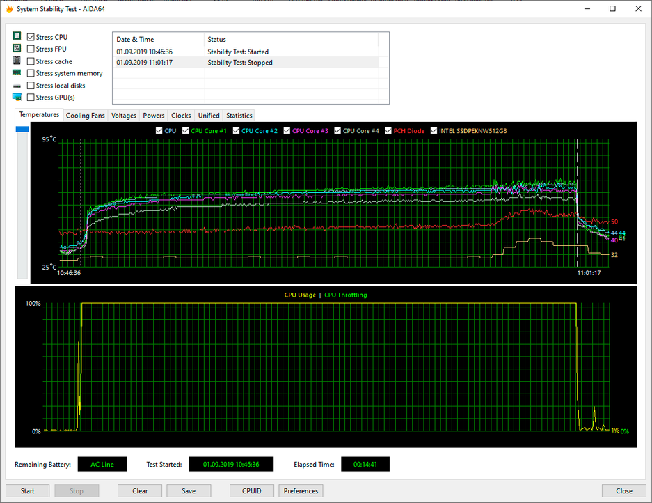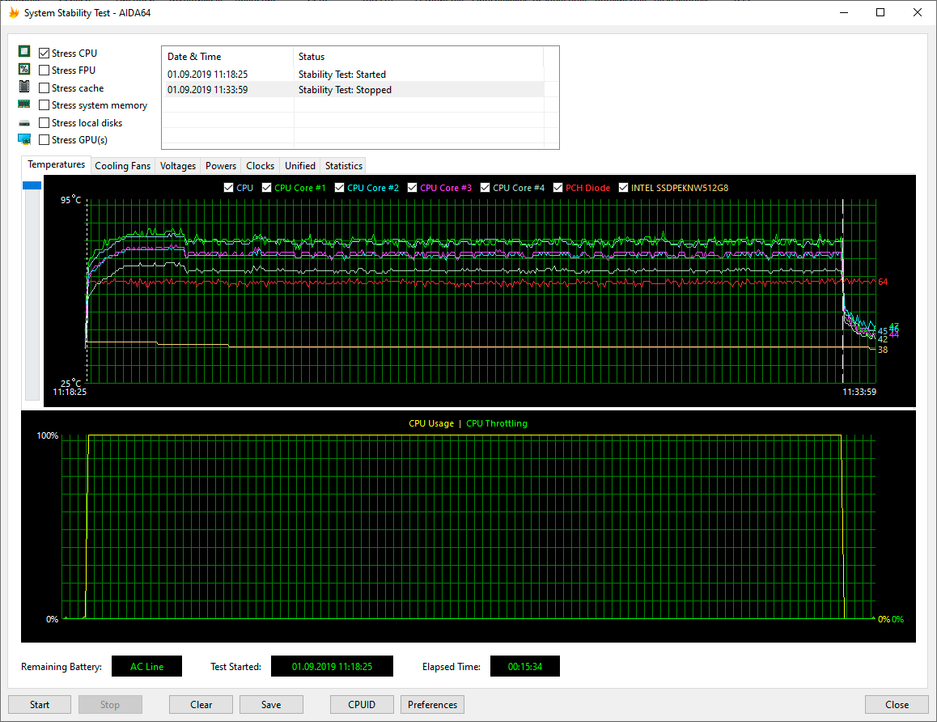 Используя стресс-тест CPU из программы AIDA64 Extreme, мы протестировали все три режима работы ноутбука при подключении к электросети и два режима при питании от аккумулятора (режим Turboв данном случае недоступен). Все тесты проводились под управлением операционной системы Windows10 Pro x64 с установкой последних доступных драйверов и обновлений. Температура в помещении во время тестирования находилась у отметки 25 градусов Цельсия.