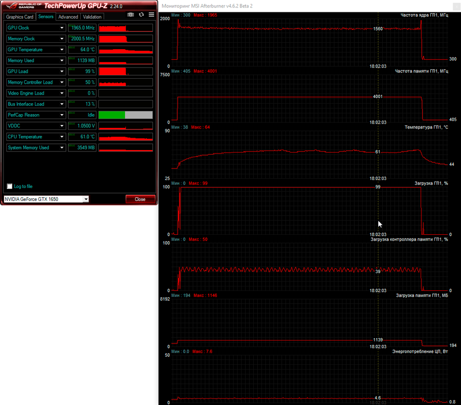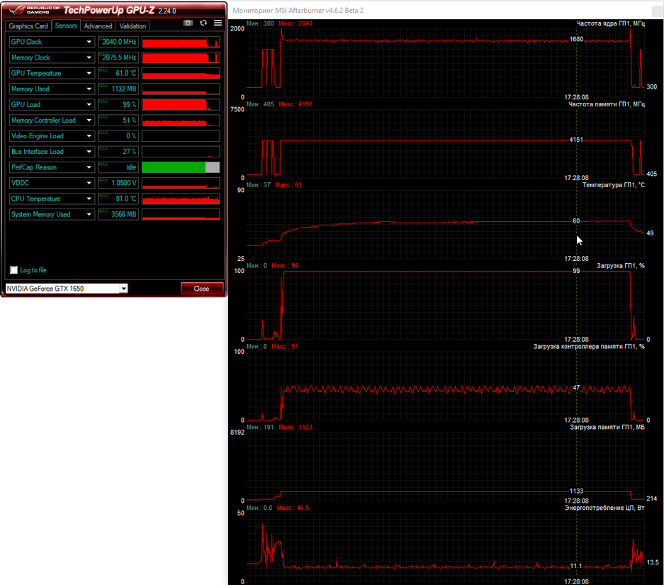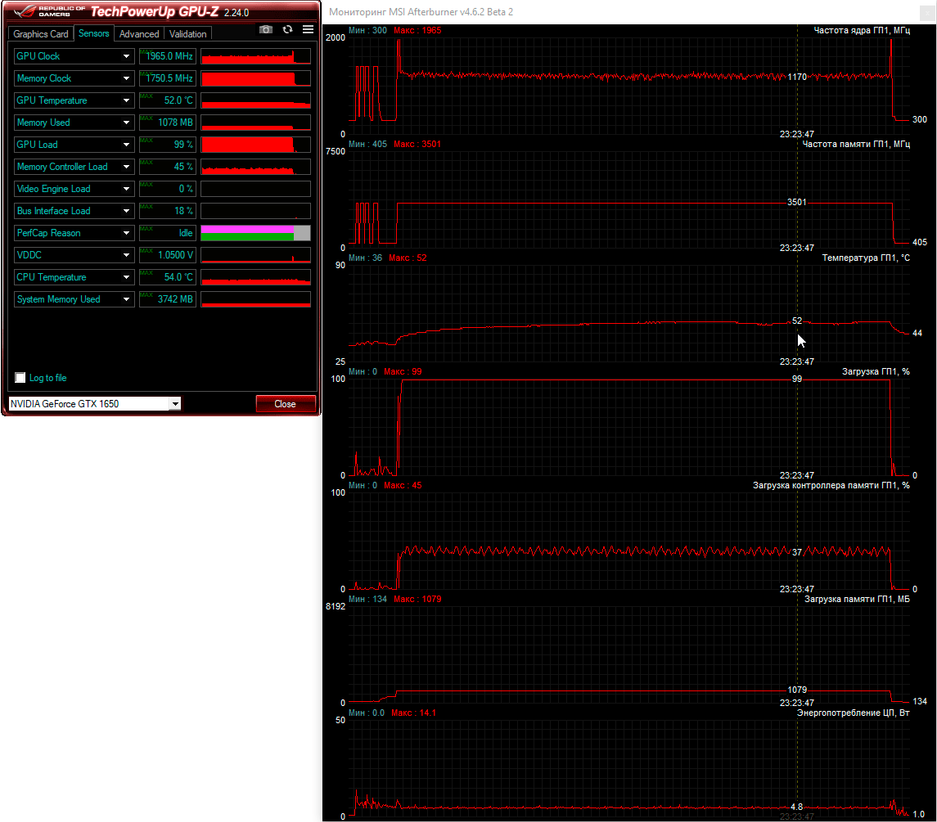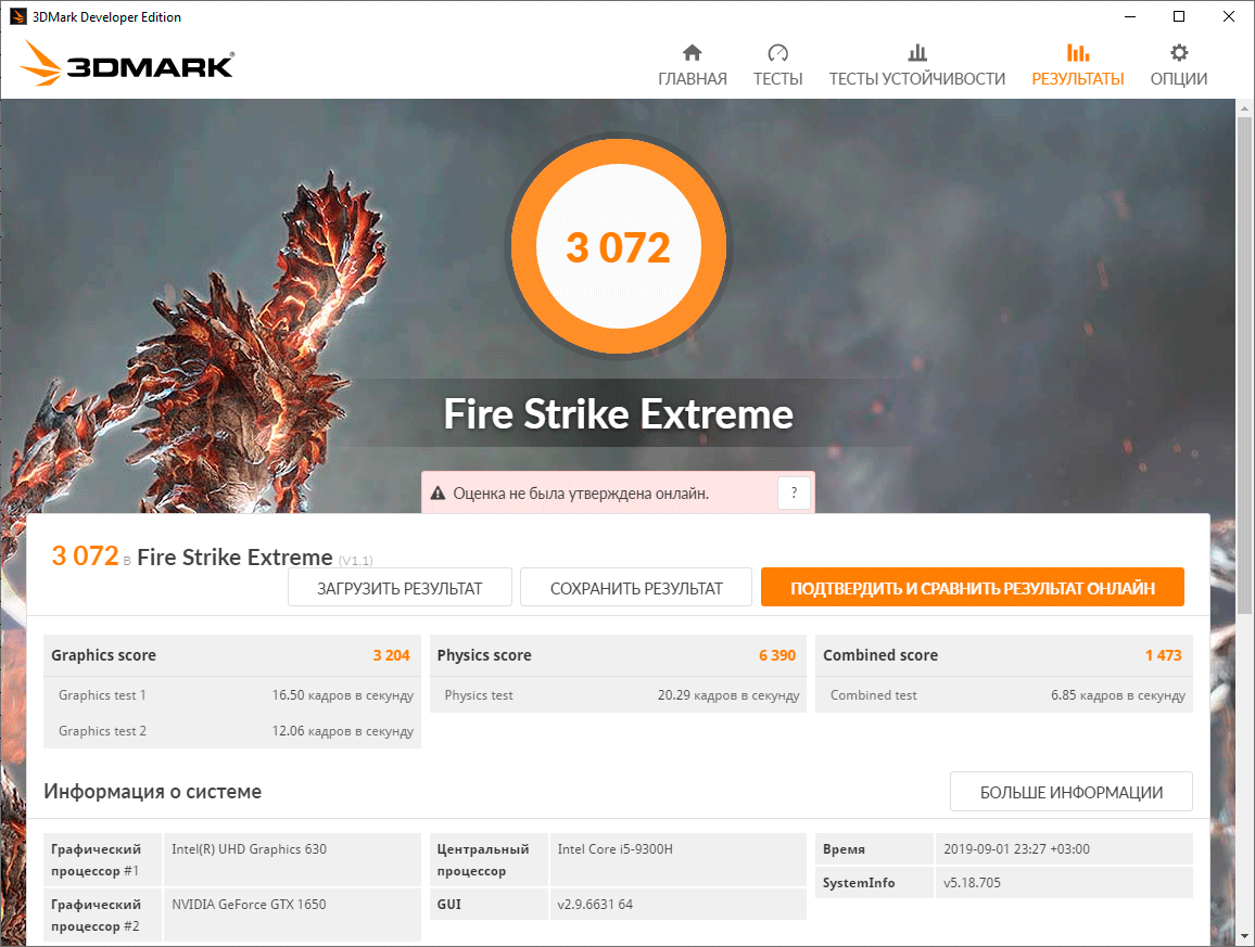 Далее перейдём к проверке графической подсистемы нового ноутбука, в качестве которой, напомним, используется довольно скромная по современным меркам видеокарта NvidiaGeForceGTX1650. Она нагружалась тестом стабильности FireStrikeExtreme из пакета 3DMark, а для мониторинга использовалась незаменимая MSI Afterburner. Сначала результаты тестирования при питании от электросети.