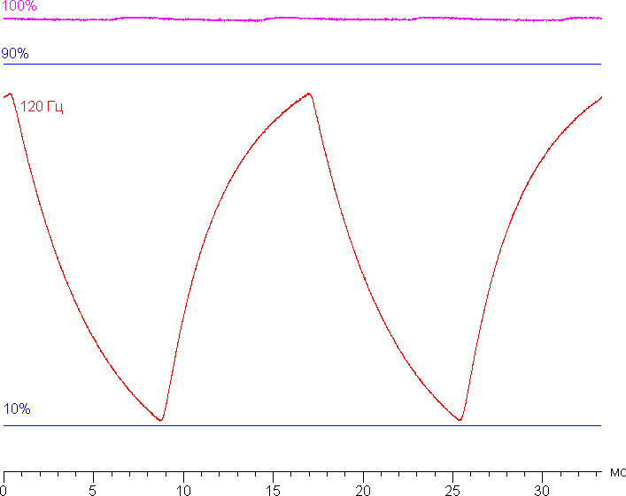 Приведём зависимость яркости от времени просто при выводе белого поля (100%), а также при чередовании белого и чёрного кадра при 120 Гц кадровой частоты: