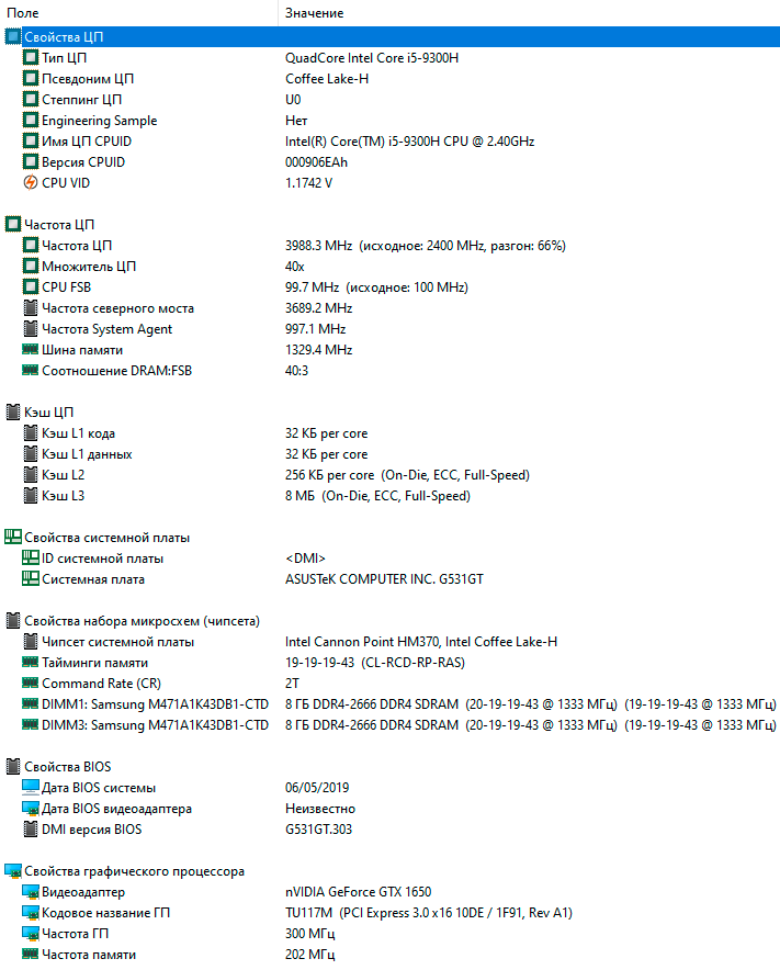 Процессор | Intel Core i5-9300H (Coffee Lake, 14 нм, 4/8, 2,4-4,1 ГГц, 45 Вт) | |