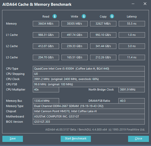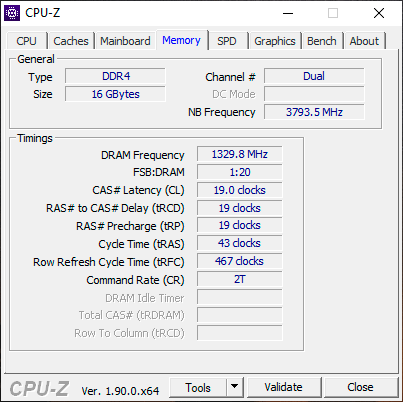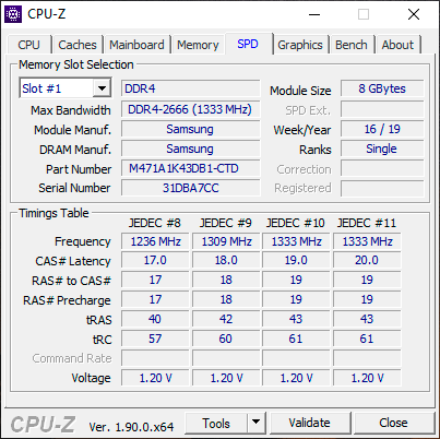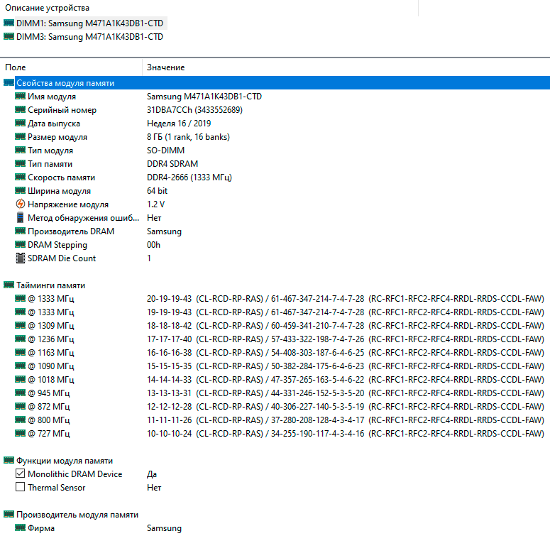 Тайминги здесь вполне типичные для ноутбуков – 19-19-19-43 при CR2, напряжение – 1,2 В. Модули выпущены компанией Samsung и имеют маркировку M471A1K43DB1-CTD.