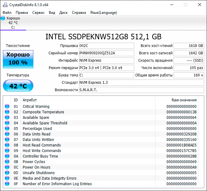 Накопитель | 1 × SSD 512 ГБ (Intel SSD 660p, модель SSDPEKNW512G8, M.2 2280, PCIe3.0 x4) | |