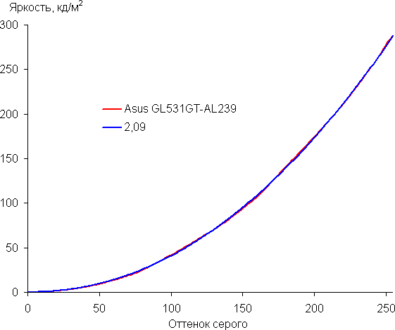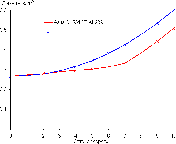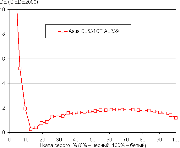 Подведём итоги. Экран ноутбука Asus GL531GT-AL239 имеет низкую максимальную яркость, поэтому устройством проблематично будет пользоваться светлым днём вне помещения. В полной темноте яркость можно понизить до комфортного уровня. К достоинствам экрана можно отнести различимость деталей в тенях, низкое значение задержки вывода, 120 Гц кадровой частоты и хороший цветовой баланс. К недостаткам — низкую стабильность чёрного к отклонению взгляда от перпендикуляра к плоскости экрана и бледные цвета (узкий цветовой охват). В целом качество экрана не очень высокое, но для игр и в помещении даже такого качества вполне достаточно.