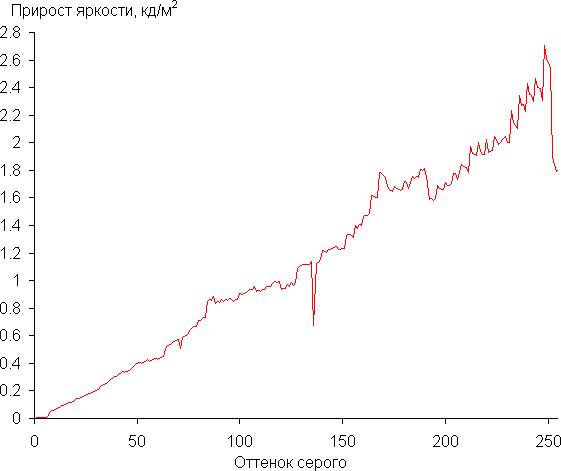 Далее мы измерили яркость 256 оттенков серого (от 0, 0, 0 до 255, 255, 255). График ниже показывает прирост (не абсолютное значение!) яркости между соседними полутонами: