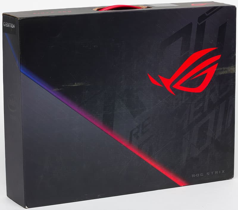 Asus ROG Strix GL531GT поставляется в большой картонной коробке, оснащённой удобной пластиковой ручкой для переноски. На чёрном фоне упаковки выделяется яркий логотип серии ROG.