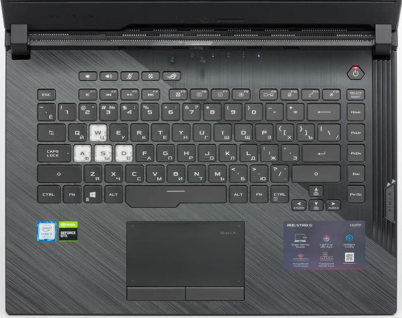 В основной рабочей зоне ноутбука размещены клавиатура, тачпад с двумя кнопками, кнопка включения с подсветкой, индикаторы и дополнительные функциональные клавиши. В числе последних две кнопки регулировки громкости, кнопка включения или отключения микрофона, а также кнопка ROG Armoury Crate (выбор режимов работы ноутбука).