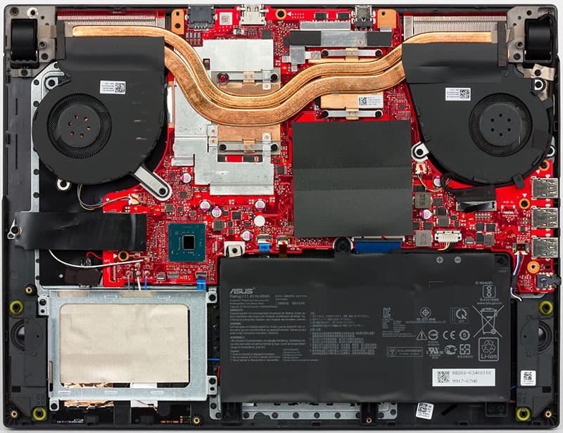 Сняв нижнюю панель Asus ROG Strix GL531GT, можно добраться до любого его компонента. Сразу же обращает на себя внимание единая для GPU и GPU система охлаждения с двумя тепловыми трубками и вентиляторами.