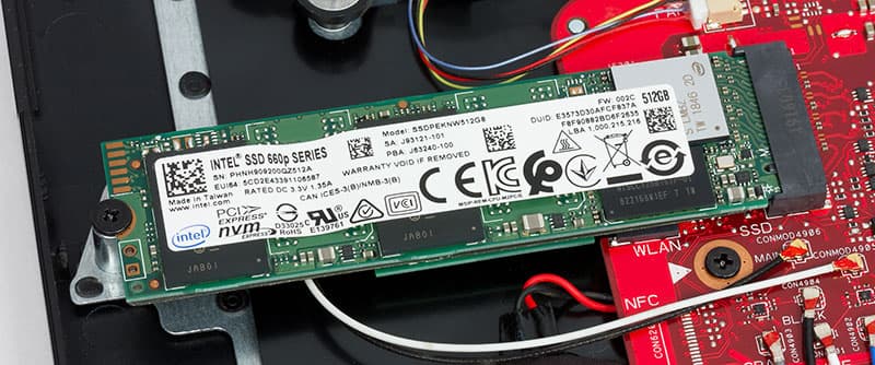 Для SSD-накопителя в ноутбуке предусмотрен один разъём M.2, где установлен твердотельный диск Intel серии 660p с маркировкой SSDPEKNW512G8 объёмом 512 ГБ.